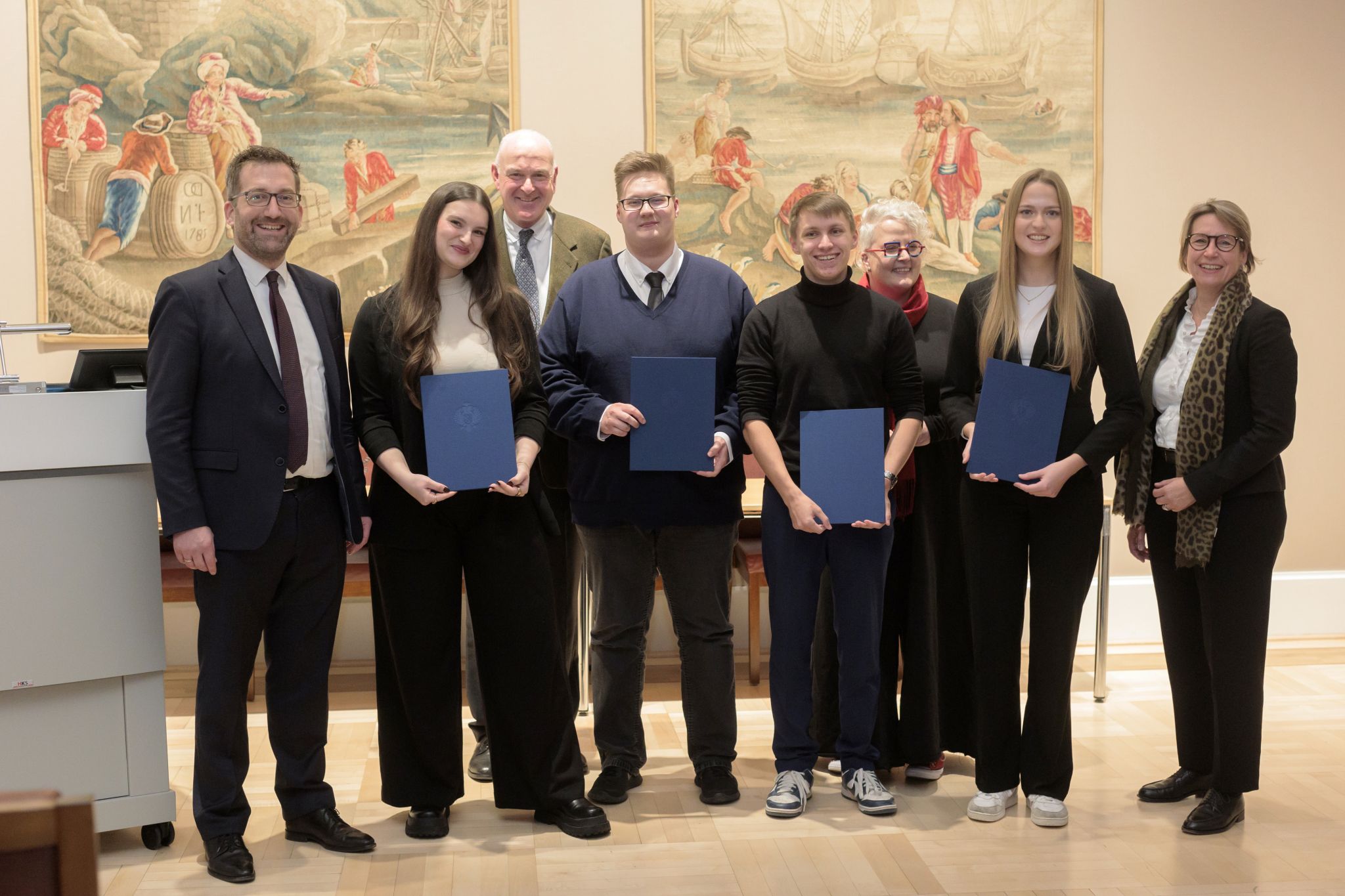Foto © Jörg Sarbach, von links: Max Roggemann (1. Vorsitzender des Vereins Bremer Holzhändler e.V.), Sofie Ax, Kuehne + Nagel (AG & Co.) KG Bremen, Präses André Grobien, Lukas Matthies, Enno Roggemann GmbH & CO. KG, Maris Post Kuehne + Nagel (AG & Co.) KG Bremen, Skrolan Schaefer, Human Resources Operations Managerin, Kuehne + Nagel (AG & Co.) KG Bremen, Karla Zoé Petermann, Kuehne + Nagel (AG & Co.) KG Bremen, Brigitta Wendisch (Dreyer & Hillmann Stiftung)