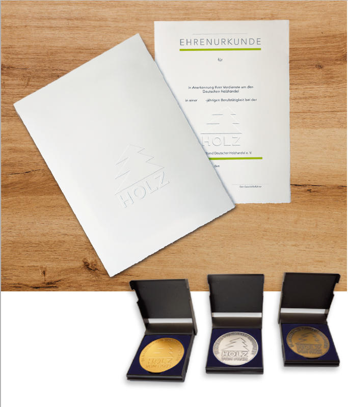Die Ehrenurkunde im DIN A4-Format ist auf wertvollem Bütten-Papier (260 g/m²) gestaltet. Die Blindprägung des Holz vom Fach